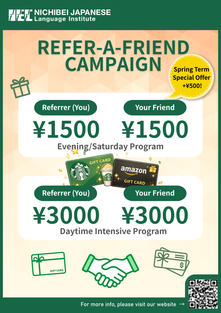 NICHIBEI is currently running a Refer-a-Friend Campaign for current students and alumni, where both you (the referrer) and your friend will receive a gift card of your choice (Amazon gift card or Starbucks gift card)!